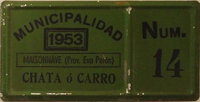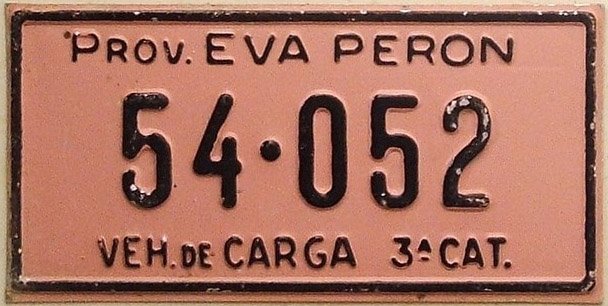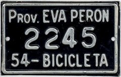 Pero en 1954 sí se emitieron patentes de tamaño chico, por lo menos hay de carruajes y de bicicleta. No se conocen piezas de este año emitidas por localidad, solo dicen Provincia Eva Perón, por lo que se intuye que se emitieron solo unas pocas variantes.
